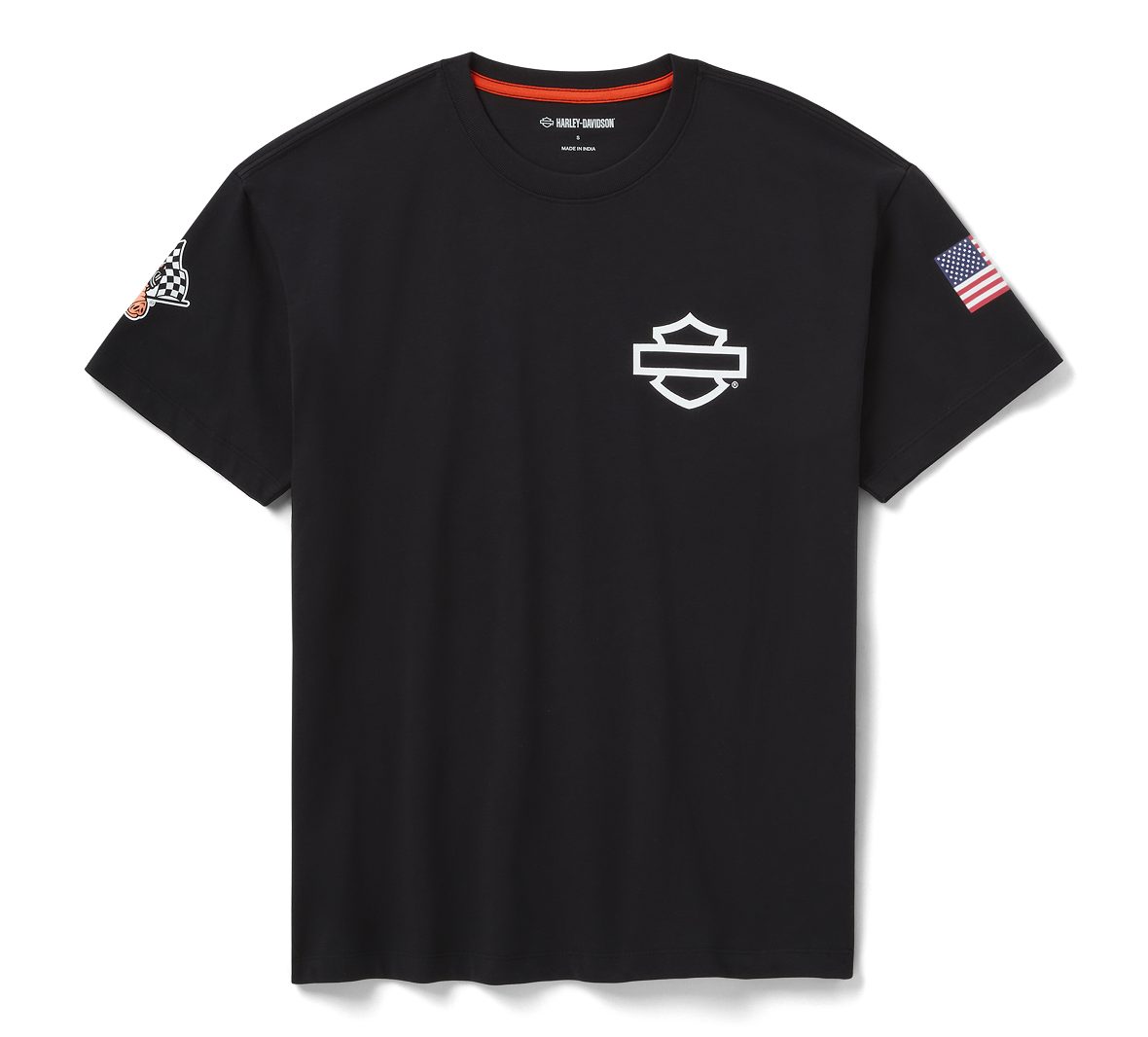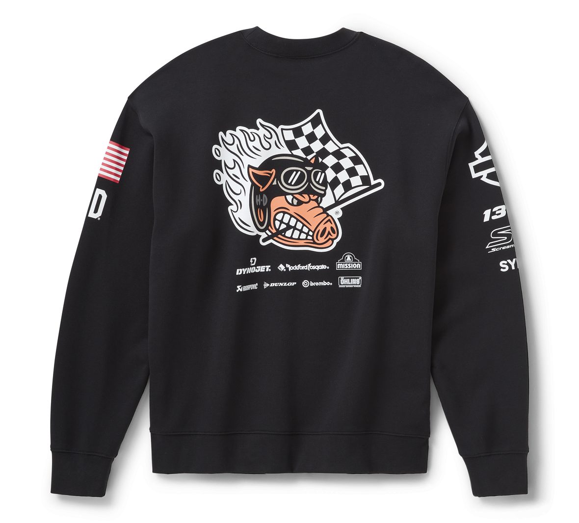 フロントはシンプルに。バー&シールドロゴのプリント。右袖にはモトアメリカのレースシリーズに参戦するハーレーダビッドソン スクリーミンイーグル ファクトリーチームの車両にも採用されている、ハーレー初のオリジナルレースマスコット、「ジョニー・ザ・ピッグ」が、左袖にはアメリカ合衆国旗(星条旗)がプリントされています。