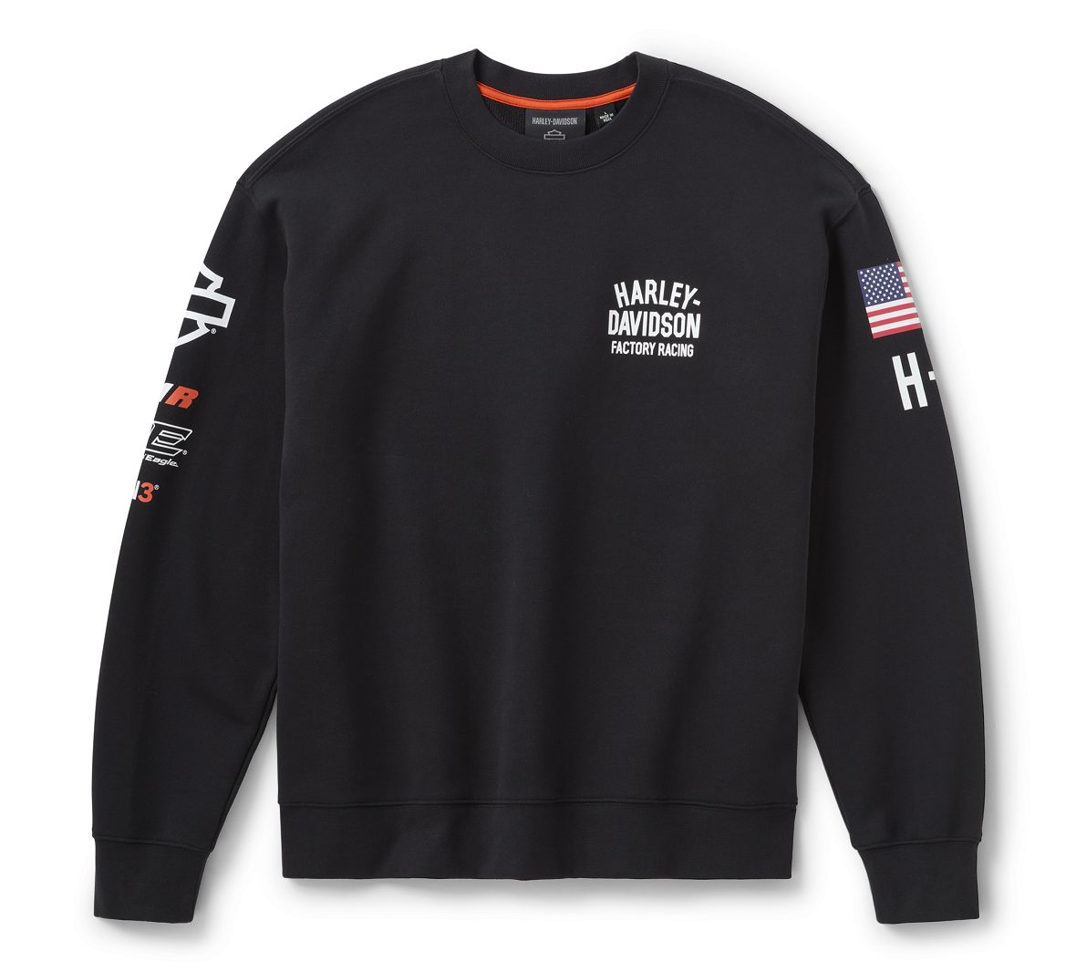 フロントには「HARLET-DAVIDSON FACTORY RACING」ロゴ。右袖には「バー&シールド」、ハーレーダビッドソン限定モデルに搭載されているスクリーミンイーグル131パワートレインの排気量を指す「131R」、ハーレーダビッドソンのパフォーマンスパーツブランド、スクリーミンイーグル「SE」、メーカー認証した高性能オイル「SYN3」のロゴがプリントされています。左袖にはアメリカ合衆国旗(星条旗)とHARLEY-DAVIDSONの「H-D」がプリントされています。