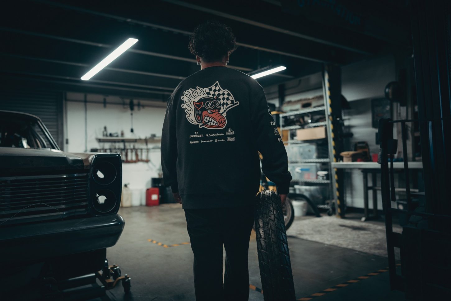 厚めのしっかりとした生地です。スウェットのバックは大きな「ジョニー・ザ・ピッグ」。こちらもスポンサー企業名がプリントされています。