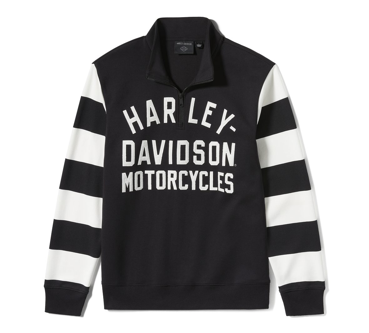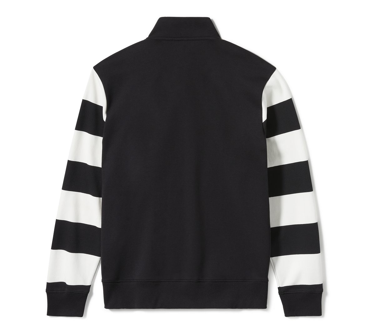 耐久性に優れた厚手のコットン/ポリエステルインターロック素材が快適な着心地を実現しています。クォータージップでリラックスしたフィット感に合わせることができます。フロントには1930年代のレーシングチームジャージを彷彿とさせるフェルトアップリケグラフィックが施されています。