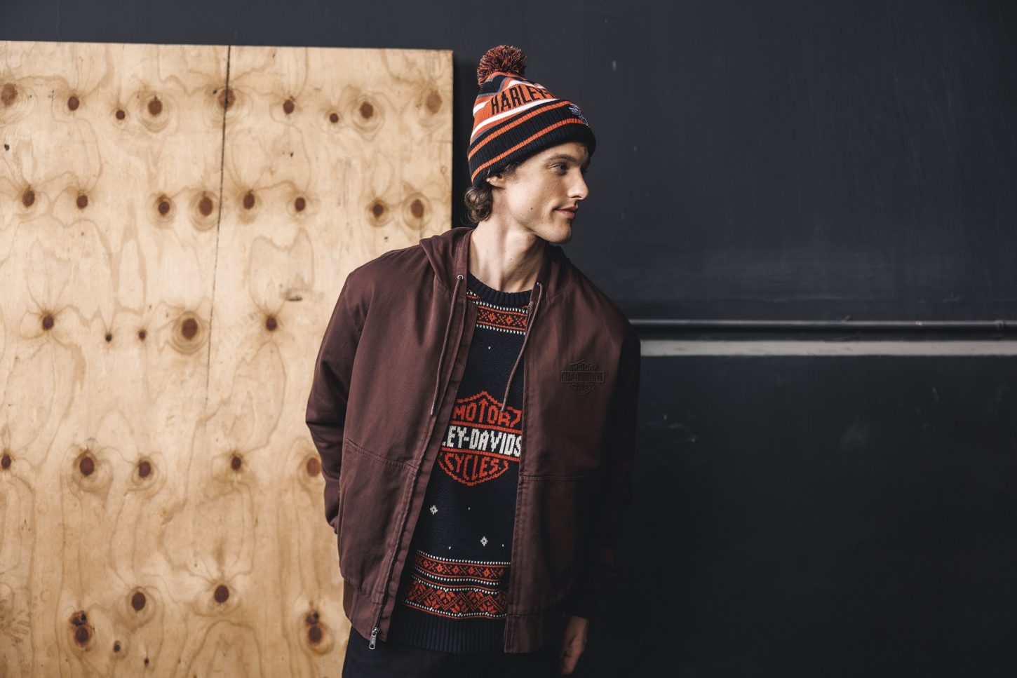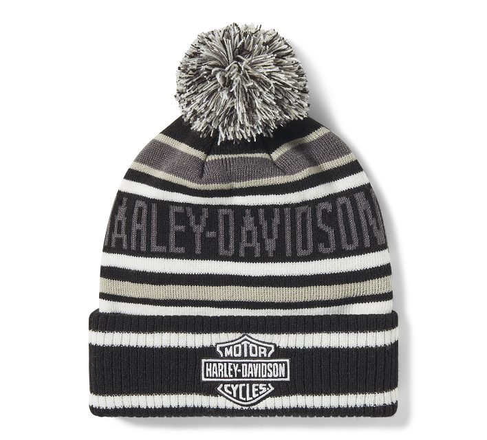 大胆で温かみのあるスタイルは、ハーレーダビッドソンのストライプポンポンビーニーで決まり。